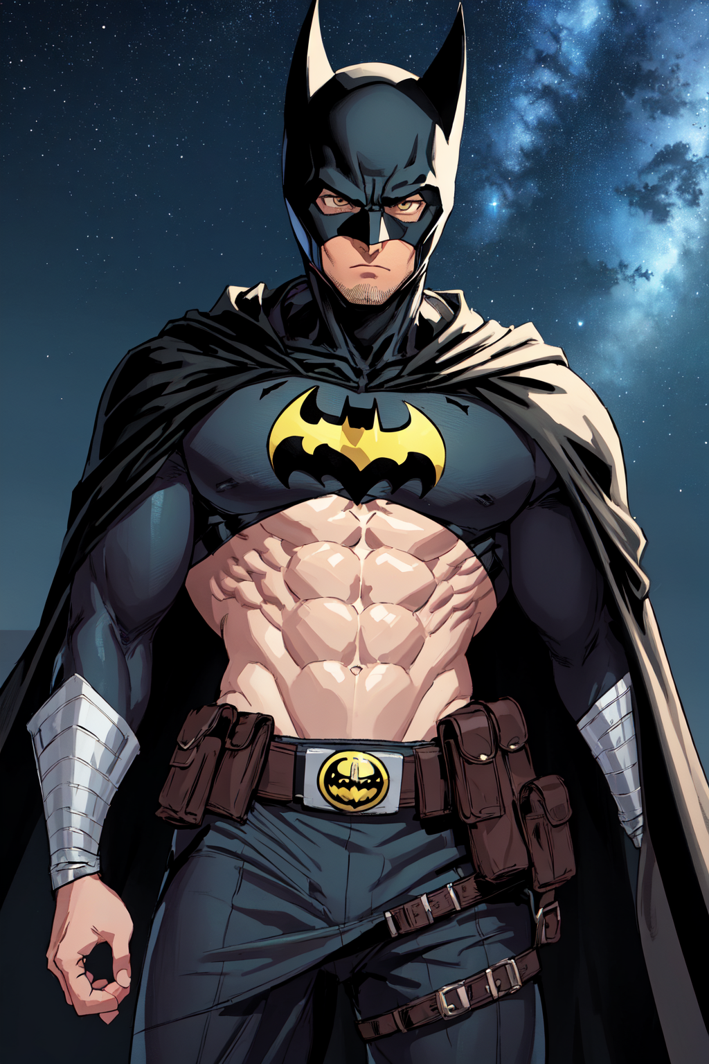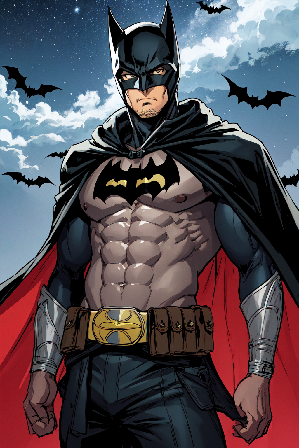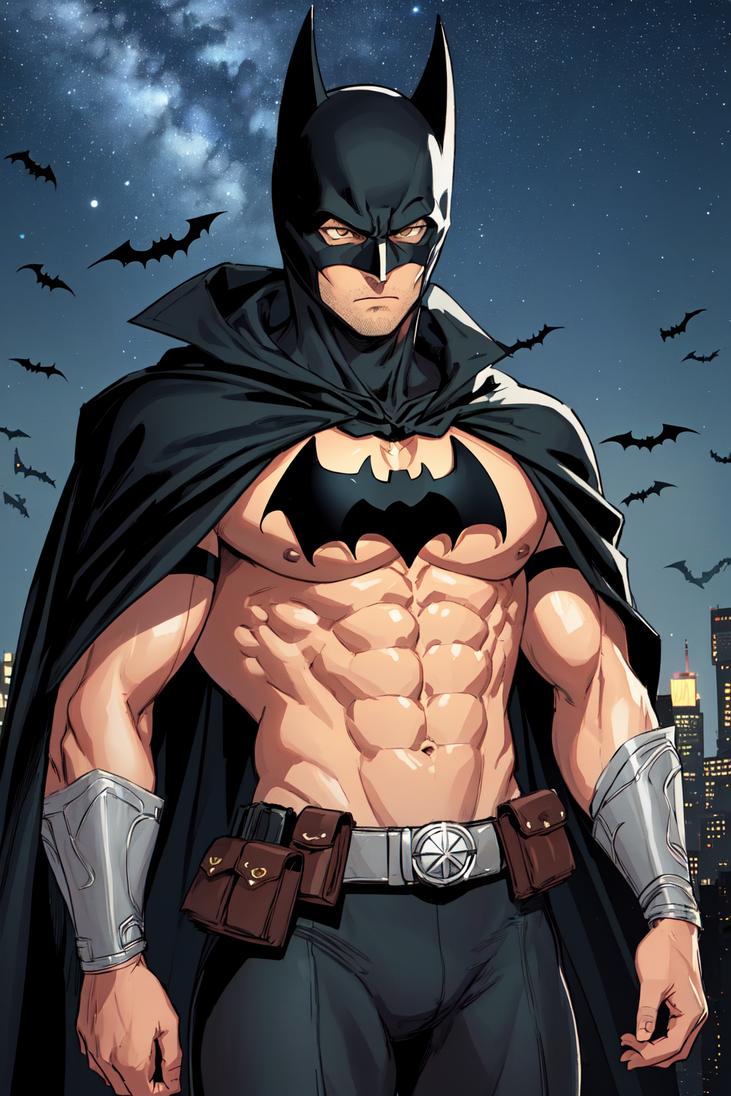 batman,1boy,night,night sky,black cape,mask,white eyes,no pupils ,superhero,bat ears,pouch,gri spandex, black bodysuit ,abs,muscular male,utility belt,vibrant, beautiful, crisp, detailed, ultra detailed, intricate, serious face, serious pose