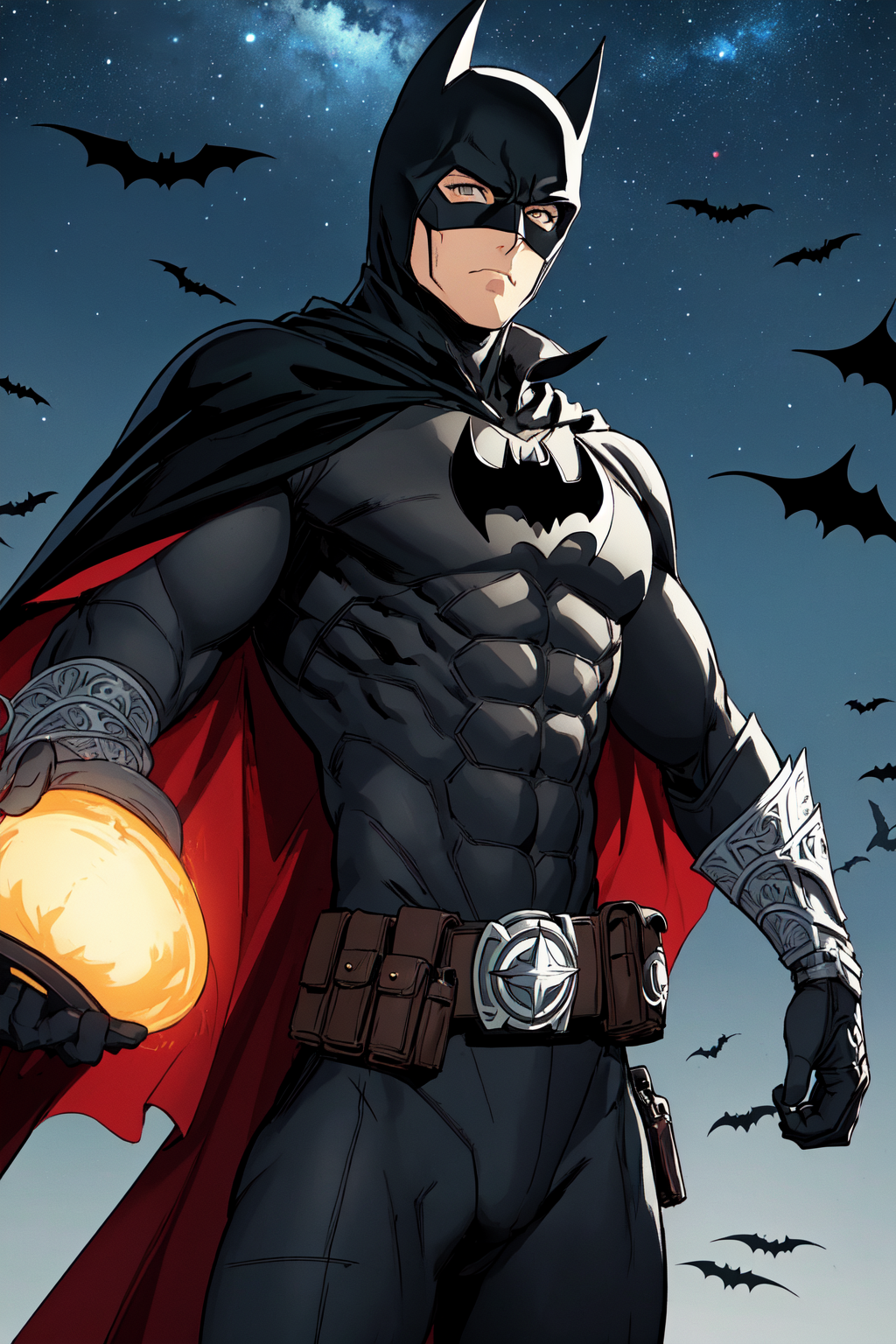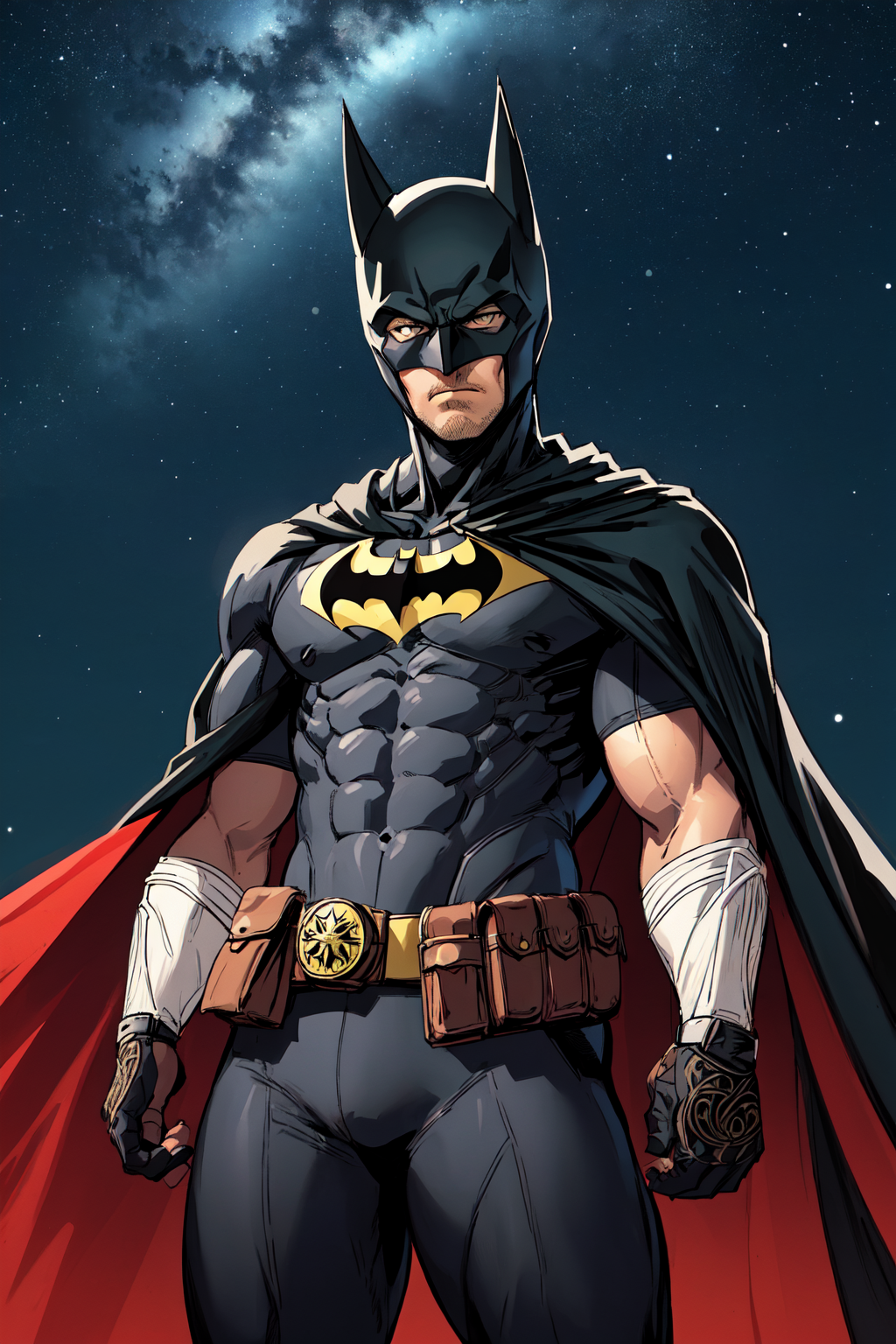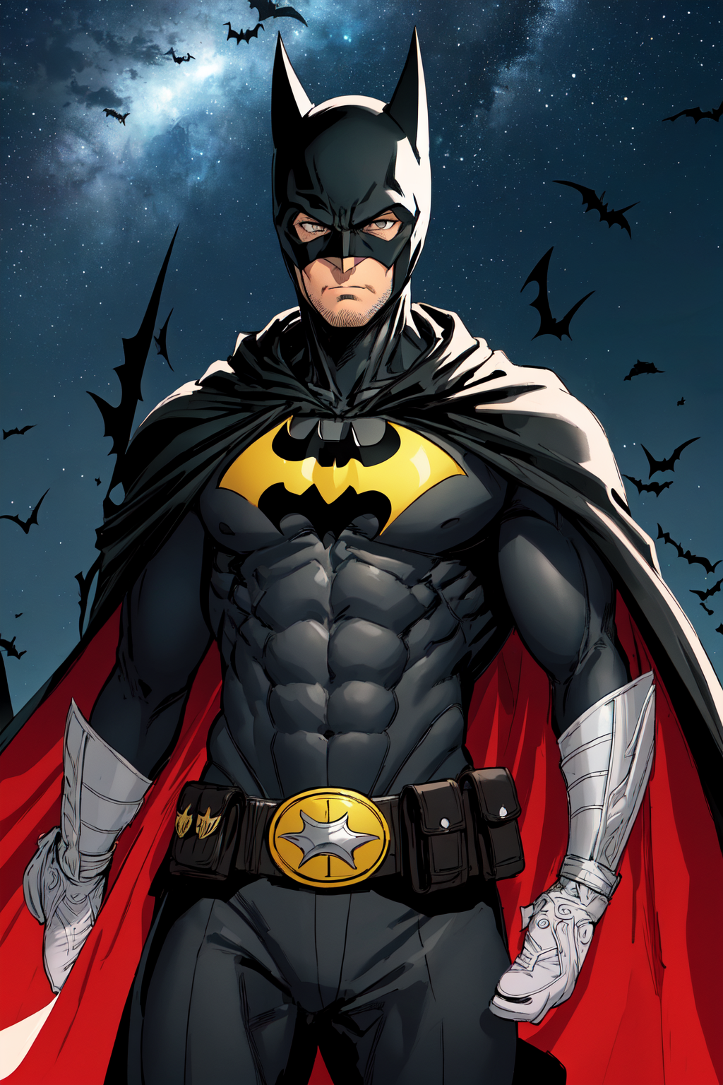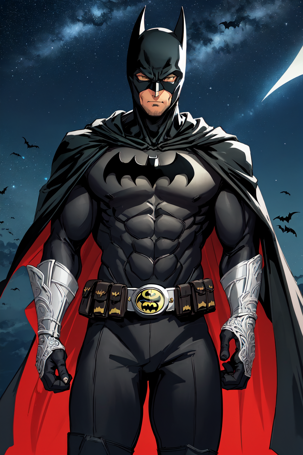 batman,1boy,night,night sky,black cape,mask,white eyes,no pupils ,superhero,bat ears,pouch,gri spandex, black bodysuit ,abs,muscular male,utility belt,vibrant, beautiful, crisp, detailed, ultra detailed, intricate, serious face, serious pose